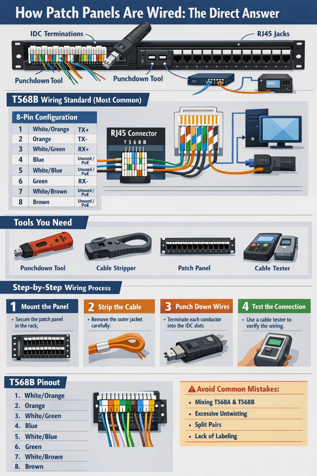 Seluruh tujuan panel tampalan dalam rak rangkaian adalah untuk bertindak sebagai titik penamat yang tetap dan teratur untuk larian kabel mendatar, memastikan infrastruktur dana bersih dan membuat pergerakan, penambahan dan perubahan dengan mudah tanpa mengganggu kabel kekal di belakang dinding. Kebanyakan pemasangan profesional menggunakan T568B sebagai standard pendawaian lalai , walaupun T568A diperlukan untuk bangunan kerajaan di bawah piawaian tertentu. Apa yang paling penting ialah konsisten — jangan sekali-kali mencampurkan piawaian merentasi larian yang sama.