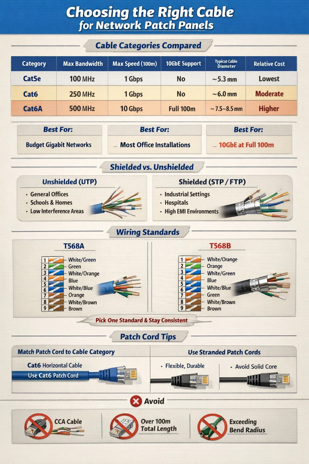 Oleh kerana panel tampalan memperkenalkan titik sambungan tambahan — penamatan tebuk bawah di belakang dan port RJ45 di hadapan — menggunakan kategori kabel yang sepadan atau melebihi kategori dinilai panel anda adalah penting. Mencampurkan panel tampalan Cat6A dengan larian mendatar Cat5e, sebagai contoh, mengehadkan sistem anda dengan serta-merta kepada prestasi Cat5e tanpa mengira nilai panel itu sendiri.