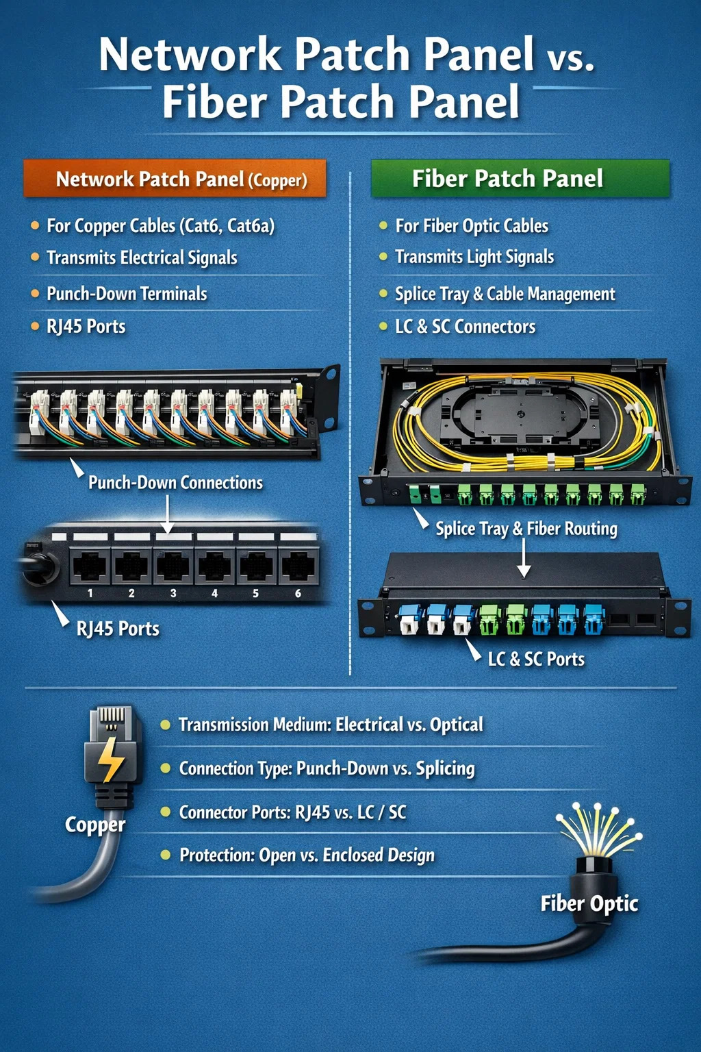 Panel Tampalan Rangkaian: Ia direka untuk kabel tembaga (iaitu, kabel rangkaian Cat6 atau Cat6a yang biasa digunakan). Ia menghubungkan wayar tembaga secara dalaman, menghantar data melalui denyutan elektrik.